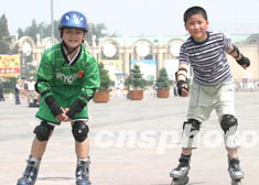两名儿童二十四日清晨在北京展览馆广场滑旱冰。随着“非典”疫情逐渐缓解,北京的中小学生纷纷走出家门,参加各种户外活动。中新社记者:赵振清