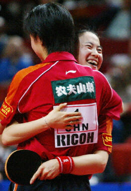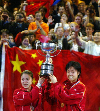 中新网5月25日电 象征世界女子乒坛双打最高荣誉的波普杯,今天再一次刻上了中国人的名字。在第47届使乒赛女双决赛中,王楠/张怡宁技高一筹,4:1战胜郭跃/牛剑峰,首次共同登顶世界最高领奖台。