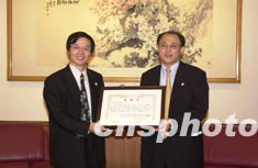日本中华总商会28日捐资六百五十万日元,支持中国抗击非典型肺炎。图为在捐款仪式上,中国驻日使馆总领事张立国向总商会会长颜安(左)颁发感谢状。中新社记者:陶光雄