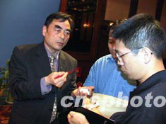 在三十日广东省新闻办举行的情况介绍会上,广州铁路集团公司总经济师谷鸿溪(左)表示,随着旅行警告的解除,粤港两地的人员来往日益频繁,他们在优化客车开行结构的同时,将继续加强广九直通车的防非典措施,让香港同胞放心乘坐。作者:刘卫勇