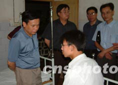 广东省始兴中学六月一日发生学生集体食物中毒意外,有五十五名中学生因食用不洁食品引起细菌性食物中毒。到六月二日下午,仍有十五人需留院观察治疗,但已确定无生命危险指征。图为中共始兴县委书记冯寿宗在医院病房看望中毒学生。作者:冯昶