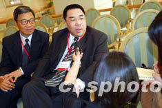 参加会议的澳门代表崔世安、瞿国英接受记者访问。