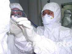 世界卫生组织视察组人员六月三日在北京解放军小汤山医院视察北京防治SARS病工作时,和医护人员进行交流。作者:安然