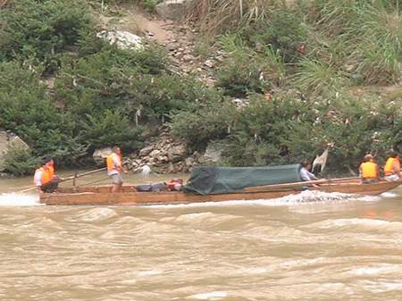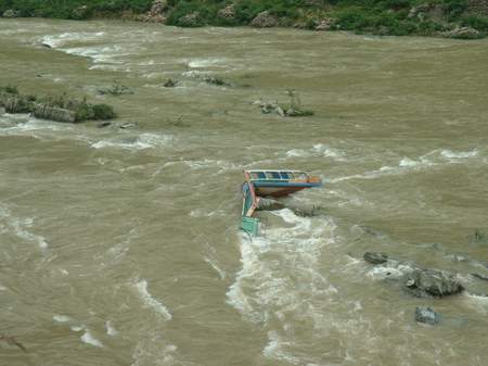 “响声很大,很响。开始我还想这船怎么那学生来撞着玩呢。”罗安忠回忆说。船横起来后不到两分钟,就折断在礁石上了,船上的几十名学生密密麻麻地几乎全部掉进水中,被湍急的河水冲洗走,只剩下一小部分人幸运地站到河滩中间露出的礁石上面,等待施救。