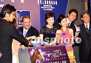 2002/2003年度香港赛马会冠军人马奖颁奖典礼”记者会六月十日在香港举行, 香港赛马会高层人士、嘉宾以及众多香港艺员在会上揭晓各个马匹奖项的候选名单,并公布有关“最受公众欢迎马匹”。 钱兴强 摄