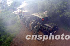 在全面防护下的中国海军某防化部队,六月于江南某地进行现代战法演练,迅速通过“战地”污染区。作者:杨波