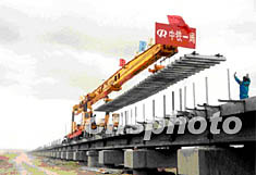 六月十二日清晨,青藏铁路铺轨顺利通过海拔四千六百多米、全长十一点七公里的清水河特大桥。清水河特大桥位于可可西里无人区,是青藏铁路最长的以桥代路工程和重点控制工程之一。“以桥代路”主要是为解决高原冻土地带路基稳定问题,各桥墩间的一千三百多个桥孔可供藏羚羊等野生动物自由迁徙。作者:赵匡胤