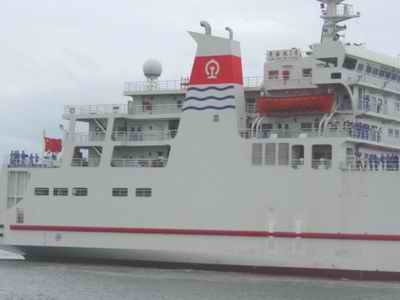 据了解,“铁二号”从设计到造型、从长相到身材,几乎和“铁一号”没有什么差异。总长度一百六十五点四米,宽二十二点六米,排水量一万二千四百吨,载车重量四千二百吨,主甲板可以载货运列车车厢四十节或客运列车十八节、旅客一千三百六十人。