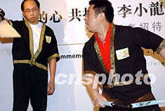 为纪念国际巨星李小龙逝世三十周年,六月十四日香港举行「龙的心、共抗炎,李小龙慈善珍藏电话卡公开发行」活动。图为李小龙弟子为宾客演示双节棍。钱兴强 摄