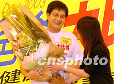 为欢度一年一度的父亲节,香港时代广场六月十五日举行“做个健康爸爸努力保护头家”活动,图为一位患“非典”家属向医生献上鲜花致意。钱兴强 摄