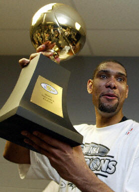 这也是马刺队史上第二座总冠军,邓肯获选最有价值球员(MVP)。邓肯毫无意外拿下决赛最有价值球员奖,他在这个系列战中,平均攻下二十四点二分,抓下十七个篮板,送出五点三次助攻以及五点三次阻攻,其中季后赛总阻攻数一百三十一次,刷新NBA季后赛纪录,而今天单场八次阻攻,也追平了总冠军赛单场阻攻纪录。