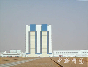 被誉为“亚洲第一大门”的酒泉卫星发射中心总装测试厂房外景。