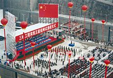 六月十六日,长江三峡双线五级船闸完成试通航,图为试通航前举行的盛大仪式。作者:孙荣刚