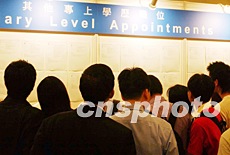 2003年6月17日,香港政府公布最新一季失业率,称其升至8.3%的历史高位,主要原因是SARS对劳工市场的影响加剧。图为正在此间举行的劳工处招聘坊,提供570个空缺,吸引众多香港专业人士前往应聘。中新社记者:潘索菲
