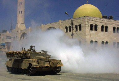 6月17日,在约旦河西岸纳布卢斯附近的阿斯卡尔难民营里,一辆以色列坦克在一座清真寺前驶过。在当天这一地区发生的巴以冲突中,以色列军队开枪打伤两名巴勒斯坦人。