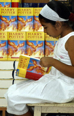在全球书迷的引颈期盼下,风靡世界的畅销儿童读物《哈利·波特》系列第五集《哈利·波特和凤凰的指令》终于在格林尼治时间20日23时(北京时间21日上午7时)全球同步发行。