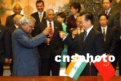 中国总理温家宝与印度总理瓦杰帕伊二十三日上午在北京人民大会堂举行会谈,并出席中印关于简化签证手续的谅解备忘录等九个文件的签字仪式。图为温家宝与瓦杰帕伊举杯共贺。中新社记者 毛建军 摄