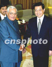 胡锦涛对瓦杰帕伊来华访问表示欢迎。他说,昨天两国总理进行了富有成果的会谈,达成了广泛共识,双方签署了《中印关系原则与全面合作宣言》等一系列合作文件,为两国关系的进一步发展奠定了法律基础。
