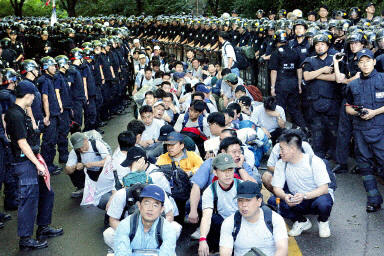 目击者说,大约5400名镇暴警员冲入汉城中部的延世大学,当时约有1500名铁路工人在这所大学静坐罢工。