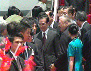 中新网6月29日电 中国国务院总理温家宝今天11:50时许乘专机抵达香港国际机场。香港特区行政长官董建华等到机场迎接。