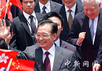 中国国务院总理温家宝,六月二十九日中午乘专机抵达香港国际机场,在香港进行为期三天的访问。图为在香港国际机场温家宝受到人们的热烈欢迎。中新社记者 钱兴强 摄