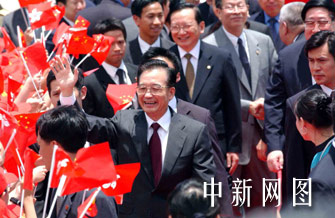 上午十一时四十分许,温家宝乘坐的专机平稳降停香港国际机场。他微笑著走出舱门,向欢迎的人群挥手致意;在走下舷梯中途,他再度挥手。
