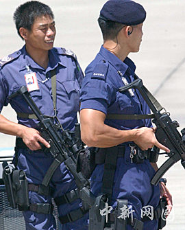 中国国务院总理温家宝,六月二十九日中午乘专机抵达香港国际机场,在香港进行为期三天的访问。图为香港国际机加强警戒。中新社记者 钱兴强 摄