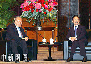 国务院总理温家宝6月29日在下榻的酒店,会见特首董建华并与工商界知名人士亲切交谈。洪少葵 摄