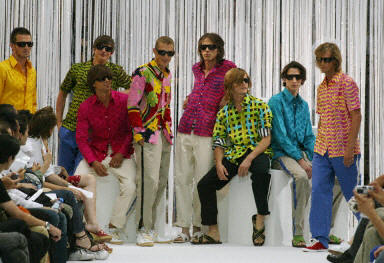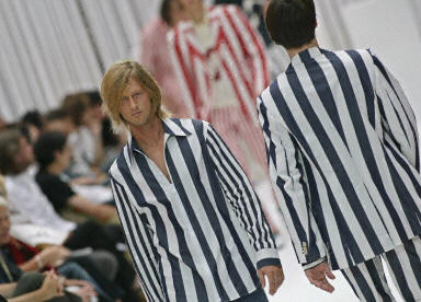 6月29日在法国巴黎举行了2004春夏流行男装发布会。图为模特们展示英国设计师保罗·史密斯的时装作品。