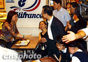 六月三十日,国务院总理温家宝在香港新城市广场参观,图为他在快餐店与市民交谈。中新社记者 潘索菲 摄