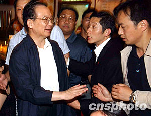 六月三十日,国务院总理温家宝在香港视察沙田新城市广场,图为他与香港市民亲切交谈。中新社记者 潘索菲 摄