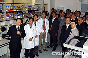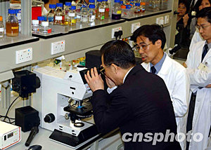 六月三十日,国务院总理温家宝参观香港大学基因中心,并聆听教授介绍,如何首先找到SARS冠状病毒。中新社记者 潘索菲 摄