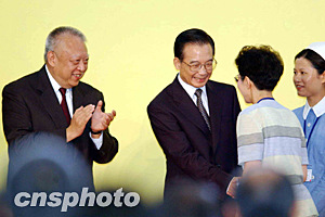 国务院总理温家宝6月30日出席表扬医护人员成功抗炎大会,向在抗击SARS中以身殉职的医护人员家属表示慰问。洪少葵 摄