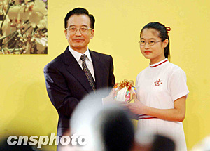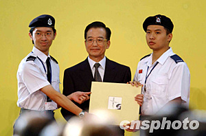 国务院总理温家宝6月30日香港表扬医护人员成功克服SARS聚会上,接受香港学生赠送纪念品。洪少葵 摄