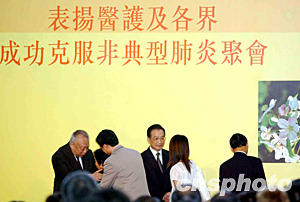 国务院总理温家宝6月30日在香港表扬医护人员成功克服SARS聚会上,表彰医护界、科研界、志愿机构、政府部门和学校的代表,并慰问因公殉职的谢婉雯医生、护士刘永佳等家人。洪少葵 摄