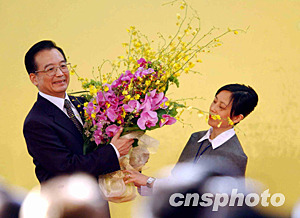国务院总理温家宝6月30日在香港出席表扬医护人员成功抗炎大会时,接受医护人员献花,总理温家宝随即将花转送在抗击SARS中殉职的医护人员家属时,受到在场人士的阵阵掌声。洪少葵 摄