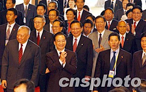 在乐声、掌声中,温家宝等主要嘉宾在主席台就坐。他的背後墙壁上悬挂著鲜艳的国旗和区旗。