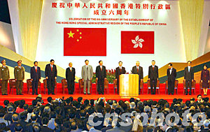 温家宝说∶今天是香港回归祖国六周年的喜庆日子。在香港万众一心战胜SARS、奋力重振经济的重要时刻,我代表中央政府和全国各族人民,向香港特别行政区政府、香港同胞和各界人士表示热烈祝贺和良好祝愿。