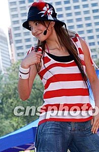 香港歌手郑希怡,7月1日在维园举办庆祝香港回归祖国活动中,载歌载舞表演助兴。洪少葵 摄