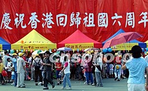 香港庆祝回归六周年在维园举办大型庆祝活动,吸引众多市民头顶烈日参与嘉年华场内游戏活动。洪少葵 摄