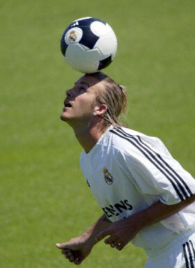 7月2日,刚刚从英超曼联转会到西甲皇家马德里的英国球星大卫·贝克汉姆在马德里身着新队服展示球技。