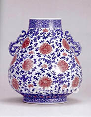 多件明清皇帝珍爱的瓷器将于七月中旬在北京华辰春季拍卖会上亮相。图为尚无公开估价的清雍正青花釉里红缠枝莲纹螭耳尊,因工艺极难而珍罕,目前仅北京故宫旧藏一件。中新社记者 贾国荣 摄
