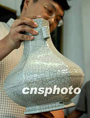 多件明清皇帝珍爱的瓷器将于七月中旬在北京华辰春季拍卖会上亮相。清代雍正和乾隆两帝酷爱宋瓷而仿哥釉六方贯耳瓶,首次向国内外公私收藏界展现,估价八十万元人币。中新社记者 贾国荣 摄