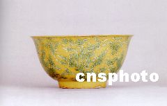 图为明嘉靖黄地绿彩福禄寿纹碗,将松竹梅与福禄寿和云芝石融为一体,未见海内外公私收藏著录,估价四十五万元人民币。中新社图