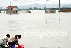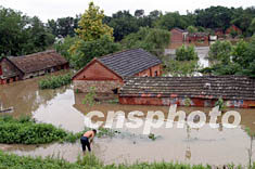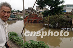 七月四日,安徽淮河分洪仍在继续,不少淮河岸边低洼地区的房屋被水淹,一位房屋的主人不忍再看被淹的房屋。中新社记者 盛佳鹏 摄