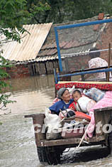 七月四日,安徽阜阳县一户农民全家乘坐拖拉机转移到高地。由于安徽淮河分洪,部分低洼地区的房屋被淹。中新社记者 盛佳鹏 摄