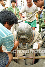 四日,上海轨道交通4号线事故抢险工作正加紧进行,一位身穿潜水服的抢险人员正准备从窨井深入水下进行作业。作者:汤彦俊