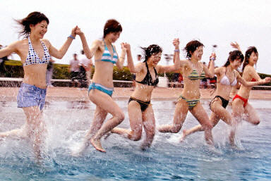 7月5日在东京西部一个小镇,大约有3,600名游客来此游泳。东京地区的温度高达30度。图为穿着性感比基尼的日本女孩高兴的奔向游泳池。