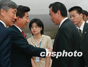 韩国总统卢武铉七日飞抵北京开始其访华行程,外交部副部长王毅前往机场迎接。中新社记者:满会乔