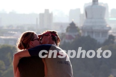 图:外国游客景山拥吻 北京旅游升温快